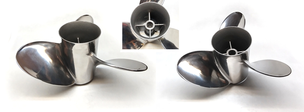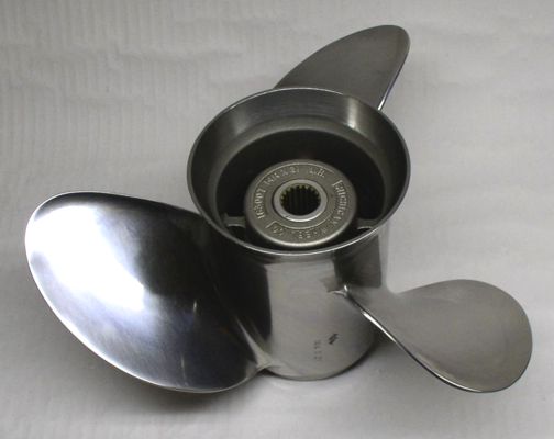Mercury Vengeance, 3 Flügel, Größe 13.8x21 RH, Edelstahl, hochglanzpoliert, OEM Nr. 48-16318-21 (equiv. neue Nr. 8M0151408), Aufnahme f. Wechselnabe, sehr guter Gebrauchtzustand, Preis Eur 456,- | |