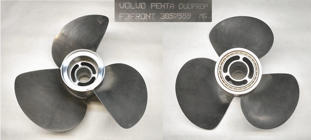 VOLVO Edelstahl Duoprop Vorderpropeller F3 für DPS Antriebe (gerade Verzahnung), 3 Blatt, 1A Gebrauchtzustand, keine Vorreparaturen , Volvo OEM Nr. 3857559, Eur 590,- | |