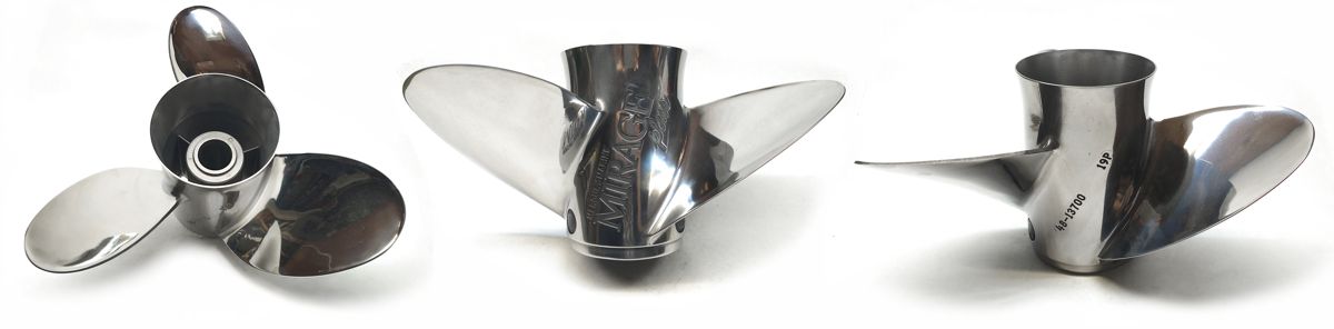 Mercury Mirage Plus, 3 Flügel, Größe 15,25x19 RH, Edelstahl, hochglanzpoliert, OEM Nr. 48-13700-19P, Aufnahme f. Wechselnabe, sehr guter Gebrauchtzustand, Preis Eur 624,- | |
