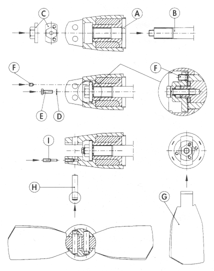 - Die zweite Sicherungsschraube (F) in das verbleibende Loch auf der Propellermutter schrauben.