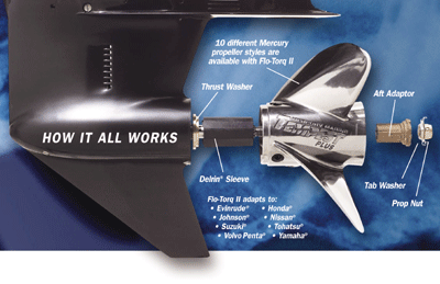 Die Korrosion der Propellernabe und die begrenzte Haltbarkeit der Gummistopfbuchse (vor allem im Salzwasser) sind bekannte Schwachstellen des Flo-Torq I Systems bei vielen Propellern. Mercury hat hier eine zuverlässige Alternative geschaffen, die die Installation erleichtert und Kosten spart. Das MMPC Flo-Torq II Antriebssystem besteht im Wesentlichen aus einer Delrin Büchse, einem darin verzahntem Adaptor aus Messing und je nach Antrieb unterschiedlichen Montageteilen. Durch die Verwendung von modernsten Materialien wie korrosionsbeständigem Messing und neu entwickelten Kunststoffteilen wird jeder Anflug von Korrosion verhindert und die Haltbarkeit um ein Vielfaches verlängert. Die Kunststoff Manschette bietet den Vorteil eines gedämpften Antriebes, der vor Stößen, Schlupf und Verwindungen beim Schalten schützt. Sie mildert die Folgen von Unterwasserberührungen, indem sie sich vom System trennt (durchdreht) und schützt so den Motor, Getriebe und Propeller vor größeren Schäden. Das Design des Flo-Torq II Systems erleichtert dem Anwender die Installation und Austausch des Propellers. Alle Teile sind einzeln erhältlich und können bei Bedarf ausgetauscht bzw. in Ersatz mitgeführt werden.